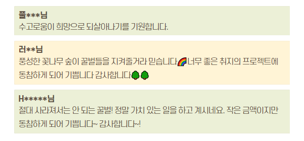 모금에 참여해주신 분들의 댓글 일부입니다. '나'의 일이 아니라며 지나칠 수 있는 '꿀벌의 일'을 '우리'의 일로 생각해 주시고 동참해주신 분들께 깊은 감사를 전합니다. 많은 분들의 응원과 후원에 힘입어 평화의숲이 해야할 일을 되새기며 꽃피는 꿀벌급식소를 최선을 다해 만들겠습니다. 평화의숲 SNS와 블로그를 통해 평화의숲이 하는 일을 가장 빠르게 만나실 수 있습니다! 평화의숲의 활동에 많은 관심과 응원 부탁드립니다!😊 |