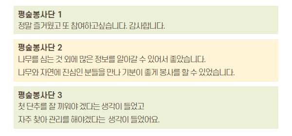 4월부터 공식적인 활동을 시작한 평숲 봉사단이 벌써 5회차 활동을 마치고 돌아왔습니다. 평숲 봉사단을 통해 활동가만큼이나 숲을 사랑하고 애정을 갖고 계신 분들이 이렇게나 많이 계셨구나 하는 생각이 들었습니다. 그동안 봉사활동에 참여해주신 분들의 활동 후기입니다. |