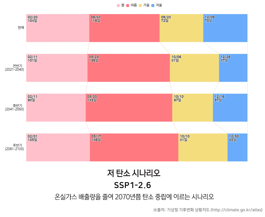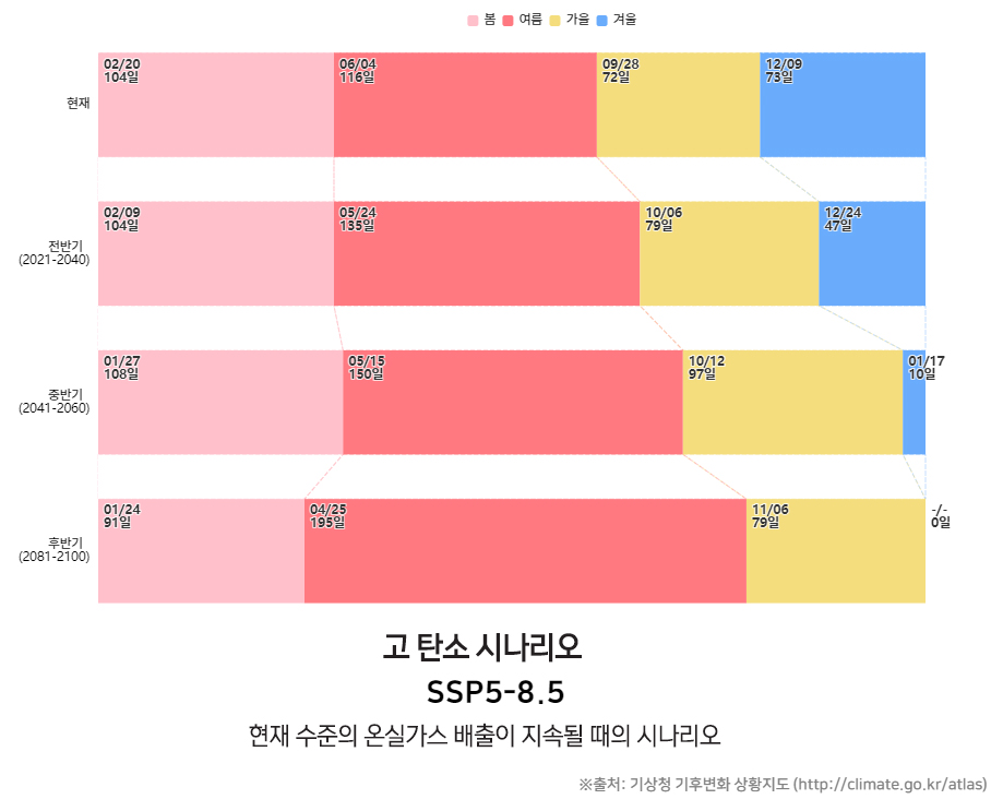 전국 기준 올해 폭염 일수는 23.5일, 열대야 일수는 23.6일입니다. 지금처럼 온실가스 배출이 계속되면 30년 뒤 2054년에는 폭염 일수가 37.6일로 늘고, 열대야 일수도 32일로 늘어납니다. 20년 뒤 2074년에는 폭염 일수가 73일, 열대야 일수는 63일로 올해보다 3배나 늘어납니다. 폭염이 늘어나니 여름은 길어지고, 겨울은 짧아집니다. 이런 현상은 한반도 남부 지방에서 더 심각합니다. 울산·부산·광주 등 8개 자치 단체는 21세기 후반 기상학적 '겨울'이 사라집니다. 21세기 후반이 되면 여름이 200일가량 이어지는데, 이때 대구의 일 최고기온은 45.7도, 광주의 일 최고기온은 44도에 이릅니다.