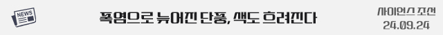 더운 추석을 보낸 것도 서러운데 단풍마저 흐리다니 아쉬운 마음이 먼저 듭니다. 단풍의 시기는 식물뿐아니라 동물들에게도 영향을 준다고 하는데요. 사람과 동물, 식물은 서로 연결된 부분이 정말 많은 것 같습니다. [기사 전문보기] |