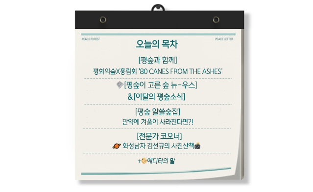 🍪에디터의 말👩지난 8월 피스레터에서 가을의 정취를 느끼는 추석을 간절히 바랐지만, 뜨거운 날씨 속에서 추석을 보냈습니다. 이제서야 진짜 가을을 느껴봅니다. 오늘 알쓸숲잡을 보면서 '오늘 우리의 선택과 행동이 우리의 내일을 만든다'는 말이 떠올랐습니다. 평화의숲도 오늘의 걸음이 내일의 평화의숲을 만들어간다는 마음가짐으로, 평화가 필요한 곳을 향해 열심히 나아가겠습니다.