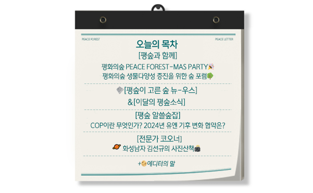 안녕하세요, 평화가 필요한 곳에 숲을 만드는 사단법인 평화의숲입니다. COP29 들어보셨나요? 11월을 앞두고 환경 분야에서는 곧 열리는 COP29, 기후회의가 중요한 이슈로 떠오르고 있습니다. 올해 지구온도가 처음으로 1.5도가 올랐습니다. 일시적으로 오른 수치지만 향후 5년 안에 사상 최악의 더위가 찾아올 수 있다는 예측도 나왔습니다. 지금 상황에서 열리는 COP29가 더욱 중요한 이유입니다. 기후변화의 심각성을 다시 한 번 일깨우고 전 세계가 힘을 모으는 계기가 되길 바랍니다. 우리가 마주한 현실은 더욱 긴급해졌습니다. 함께 관심과 마음을 모아야 이 문제를 해결할 수 있습니다! 오늘 피스레터가 님의 작은 행동을 위한 '넛지'가 되길 바라며 10월 피스레터 지금 시작합니다!