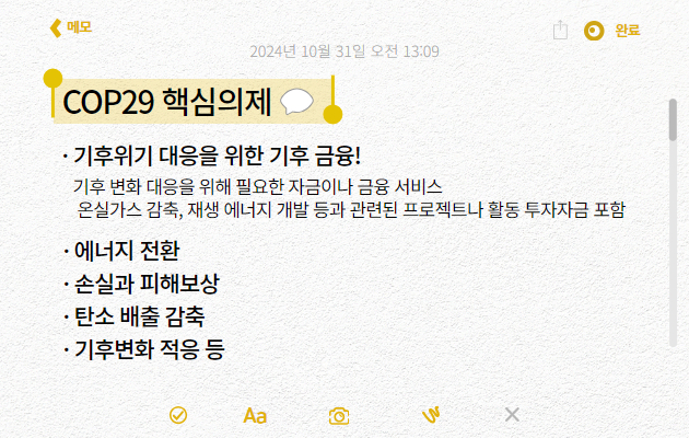 이번 COP29는 11월 아제르바이잔에서 열려요. 올해 COP29의 핵심의제는 기후위기 대응을 위한 기후 금융이 핵심 아젠다가 될 전망인데요. 역대 처음으로 지구 평균기온 상승폭이 1.5℃를 넘어선 연도에 치뤄지는 COP이 될 것이 확실시되면서 기후위기 대응을 당장 실행에 옮기는 것이 무엇보다 중요해졌습니다. 이를 위해 COP29에서는 기후금융, 에너지 전환, 손실과 피해보상, 탄소 배출 감축, 기후변화 적응 등과 같은 중요한 주제에 대해 협력 방안을 모색할 예정입니다. |