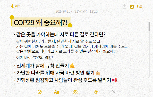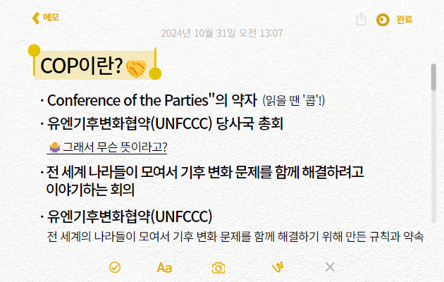 COP은 "Conference of the Parties"의 약자로, 유엔기후변화협약(UNFCCC) 당사국 총회를 의미합니다. 말이 벌써 어렵죠? 한마디로 COP은 전 세계 나라들이 모여서 기후 변화 문제를 함께 해결하려고 이야기하는 회의에요. 유엔기후변화협약(UNFCCC)은 "전 세계의 나라들이 모여서 기후 변화 문제를 함께 해결하기 위해 만든 규칙과 약속"을 말해요. 그래서 COP29은 제29차 유엔기후변화 협약 당사국 총회를 뜻해요. 지구를 보호하기 위한 중요한 결정이 이루어지는 자리라고 할 수 있어요! (읽으실 때는 알파벳 그대로 '콮'으로 읽으시면 돼요!) |