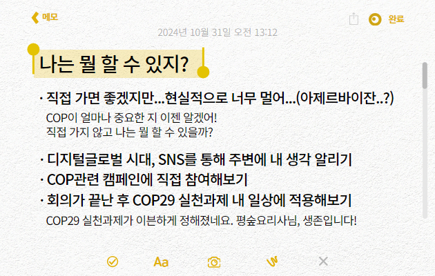 COP29가 개최되는 동안 세미나에 직접 참여할 수도 있지만 거리상의 문제 등 직접 참여하기는 현실적으로 어렵습니다. 님의 의견을 SNS를 통해 알리시거나 관련 캠페인에 참여해 목소리를 내는 방법도 있어요. 회의가 끝난 후 COP29 실천과제를 확인하며 님의 일상에 직접 적용해 볼 수도 있어요! 지구를 지키기 위해 전세계가 머리를 맞대는 COP29는 11월 11일에서 22일까지 진행됩니다. 기후변화의 심각성에 모두가 공감하는 지금은 행동으로 나아갈 때입니다. 님도 함께 고민해주시고 행동해 주세요! |