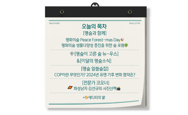 안녕하세요, 평화가 필요한 곳에 숲을 만드는 사단법인 평화의숲입니다. COP29 들어보셨나요? 11월을 앞두고 환경 분야에서는 곧 열리는 COP29, 기후회의가 중요한 이슈로 떠오르고 있습니다. 올해 지구온도가 처음으로 1.5도가 올랐습니다. 일시적으로 오른 수치지만 향후 5년 안에 사상 최악의 더위가 찾아올 수 있다는 예측도 나왔습니다. 지금 상황에서 열리는 COP29가 더욱 중요한 이유입니다. 기후변화의 심각성을 다시 한 번 일깨우고 전 세계가 힘을 모으는 계기가 되길 바랍니다. 우리가 마주한 현실은 더욱 긴급해졌습니다. 함께 관심과 마음을 모아야 이 문제를 해결할 수 있습니다! 오늘 피스레터가 님의 작은 행동을 위한 '넛지'가 되길 바라며 10월 피스레터 지금 시작합니다!