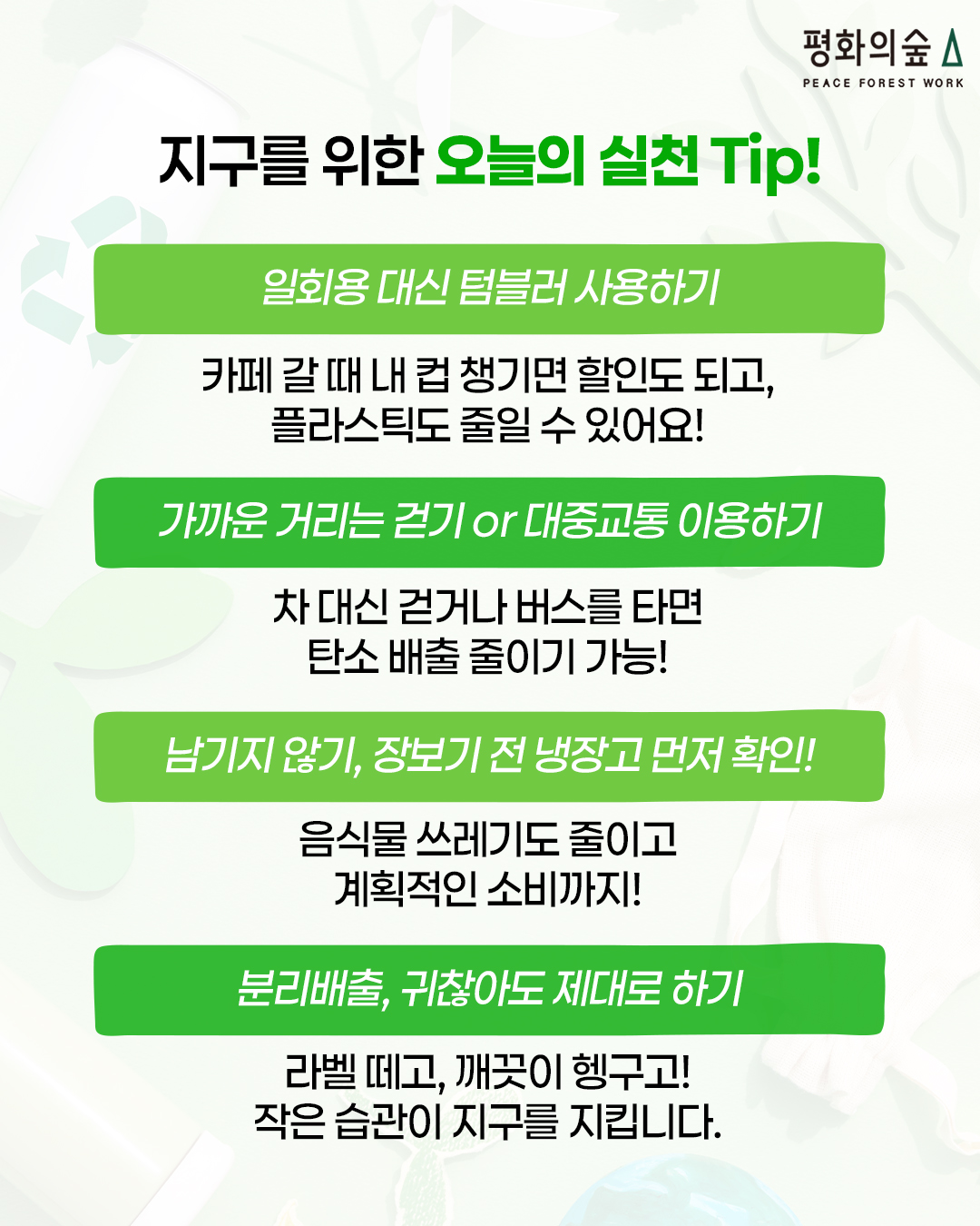 아직 늦지 않았습니다. 우리가 함께 만든 변화가 조금씩, 그리고 분명히 세상을 바꾸고 있습니다. 님도 함께해 주세요. 우리의 작은 실천이 모여, 지구에 평화를 심을 수 있습니다🌿 |