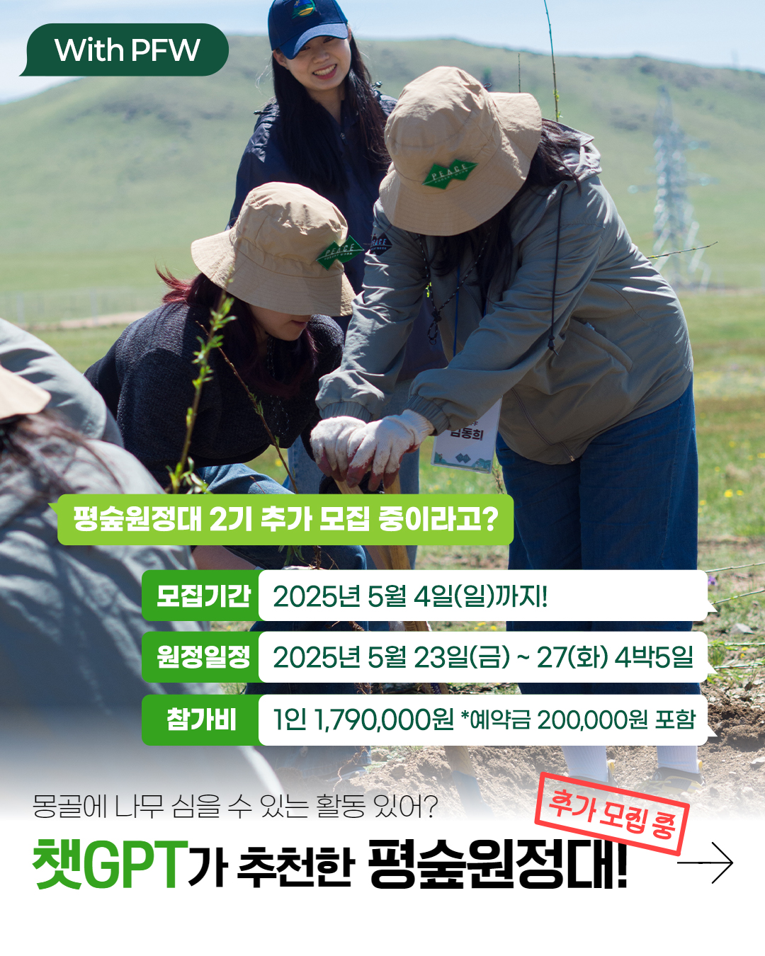 맨손으로 흙을 만지고, 사막 한가운데 푸른 나무를 심으며 몽골에 평화의 숲을 만들어갔던 그 감동의 여정이, 올해 다시 이어집니다! 이번 평숲원정대 2기는 특별히 챗GPT 추천으로 신청하신 분들도 계셨을 만큼 많은 관심을 받고 있는데요. 더 많은 분들과 이 뜻깊은 경험을 나누기 위해 추가 모집을 시작했습니다! 자연을 사랑하고, 숲를 위한 한 걸음을 내딛고 싶은 분이라면 누구나 함께할 수 있어요. 단순한 여행이 아닌 의미 있는 활동을 찾고 계신 분, 기후변화 대응에 직접 참여하고 싶은 분, 광활한 몽골 초원에서 힐링하고 싶은 분 , 그리고 아직 망설이고 계신 분까지! 지금이 바로 신청할 시간입니다. 손으로 흙을 만지고, 직접 나무를 심는 특별한 4박 5일! 당신의 작은 한 걸음이, 큰 변화를 만들어냅니다. 평숲원정대 2기에 함께해 주세요!💚