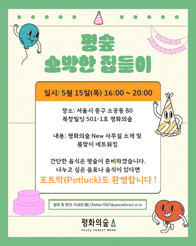 📞 인원 파악을 위해 참석을 원하시는 분들은 평숲 이세희 매니저(sheri1697@peaceforest.or.kr)에게 미리 연락 부탁드릴게요!