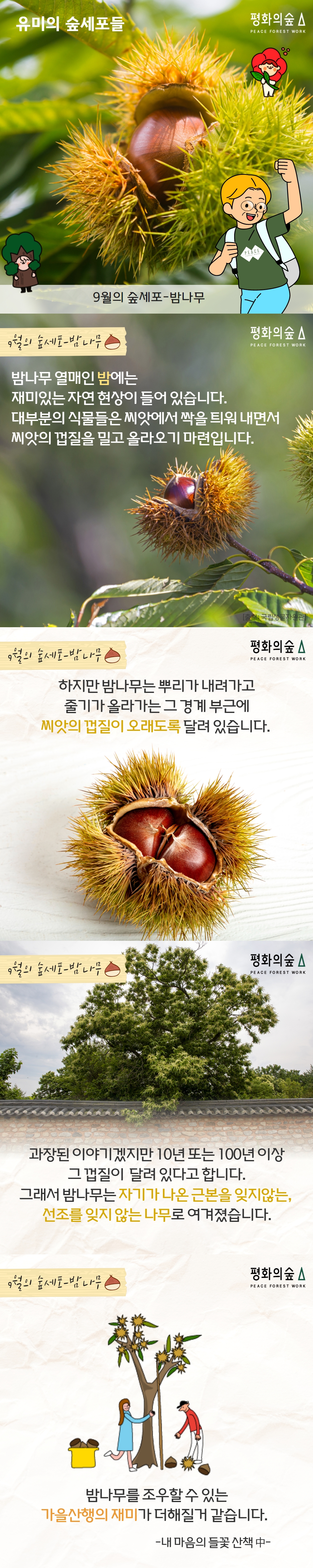 밤나무의 꽃말은 '포근한 사랑', '정의', '진심'입니다. 뾰족한 겉모습을 가진 밤송이가 이런 부드러운 꽃말의 소유자였다니!ㅎㅎ외강내유의 밤나무라고 불러야겠습니다. 밤나무의 꽃말처럼 님의 추석이 가족들과 친구들과 함께 포근한 사랑을 만나는 시간이 되시길 바랍니다. 평화의숲이 이번 피스레터에 담은 '진심'도 님께 닿았기를 바랍니다. 9월의 나날이 평화로우셨길 바라며, 풍성한 한가위 보내세요.