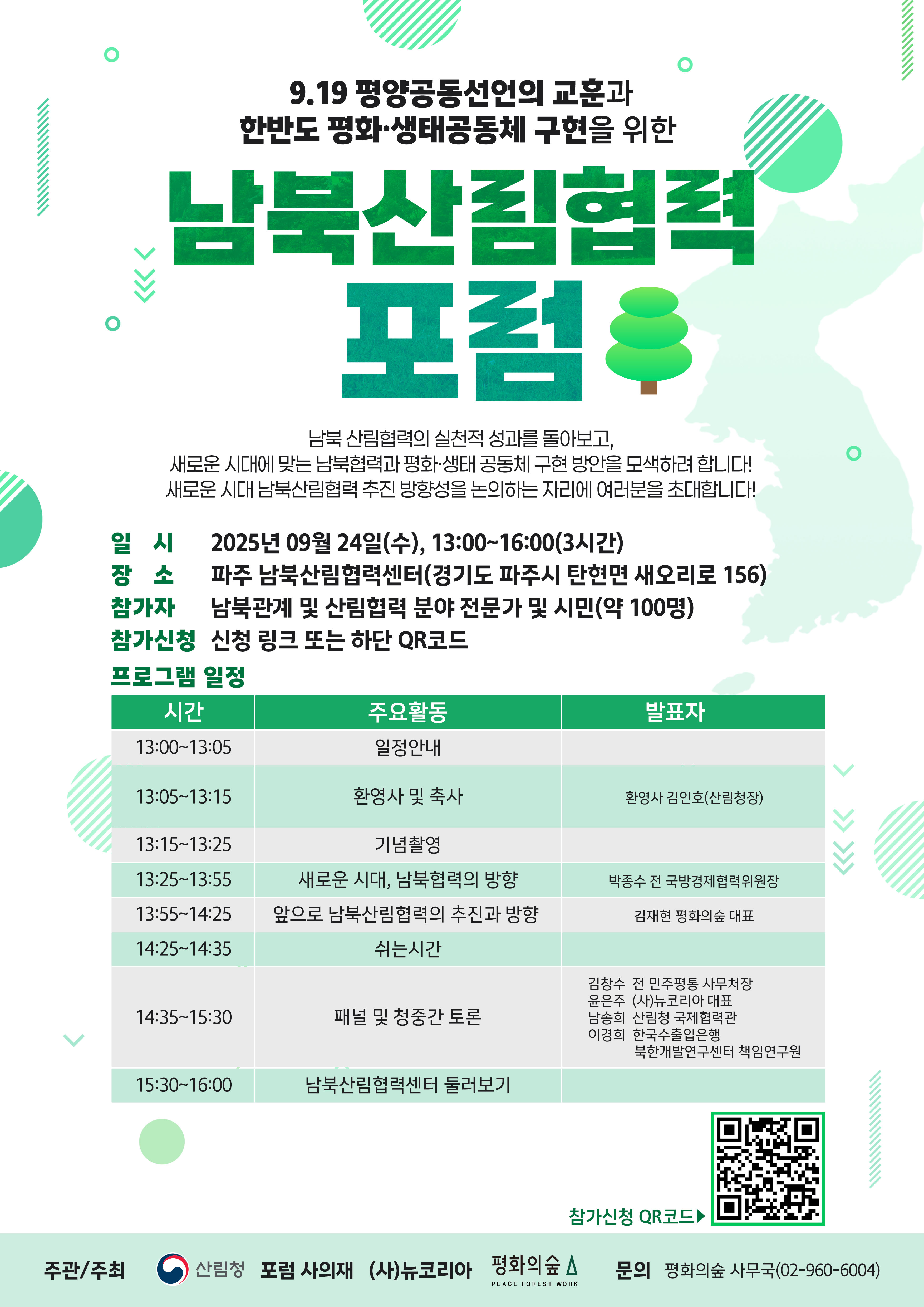 9.19 평양공동선언 7주년을 맞아, 남과 북의 산림을 비롯한 자연생태계 보호와 복원을 위한 협력을 위해 (사)평화의숲, 포럼 사의재, (사)뉴코리아, 산림청이 함께 <남북산림협력 포럼>을 개최합니다. 이번 포럼에서는 현재 진행 중인 남북 산림협력의 실천적 성과를 돌아보고, 새로운 시대에 맞는 남북협력과 평화·생태 공동체 구현 방안을 모색하려 합니다! 새로운 시대 남북산림협력 추진 방향성을 논의하는 자리에 님을 초대합니다! |